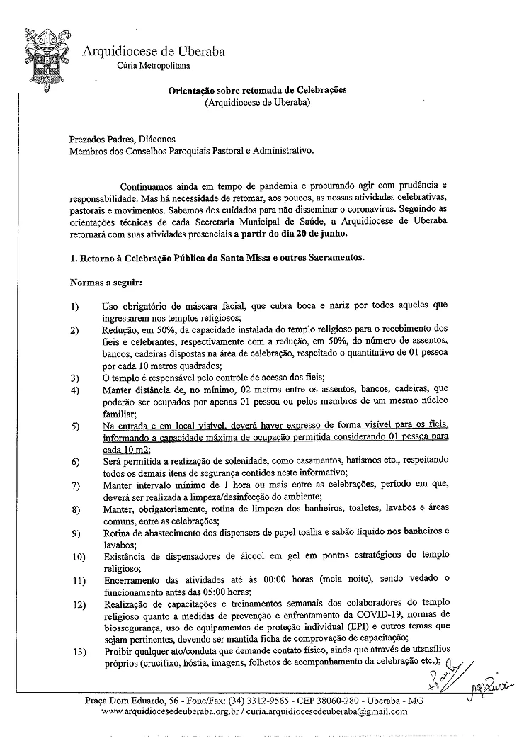Observação: As normas elencadas estão de acordo com as recomendações dos órgãos competentes e autoridades sanitárias (Ministério da Saúde, ANVISA, OMS, VISA estadual e municipal), foram emitidas pelo município de Uberaba, mas devem ser observadas em todas as Paróquias da Arquidiocese. Caso algum município tenha alguma norma complementar, esta deverá ser acrescentada conforme seus respectivos municípios.